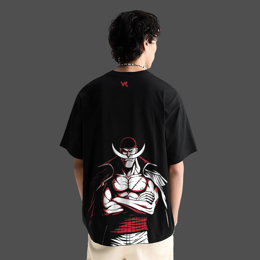 - Bold Oversized Fit black T-shirt featuring Whitebeard, the strongest man in the world.