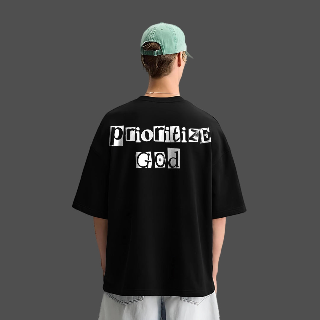 - Faith-driven Oversized Fit black T-shirt with typography 'Prioritize God'.